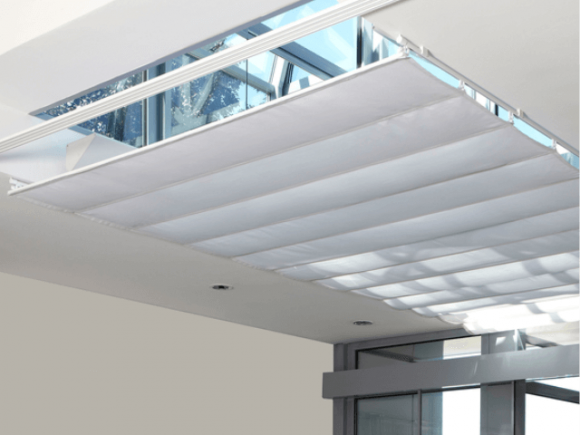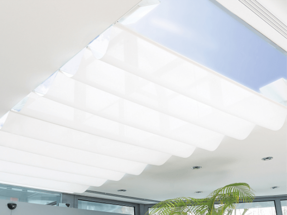 Für großzügige Glasarchitekturen werden oft funktionelle und zugleich dekorative Sicht- und Sonnenschutzanlagen gewünscht. Diese Kombination bieten Beschattungsanlagen - speziell für Wintergärten, Oberlichter oder Lichtbänder eine perfekte Lösung. Die gleichmäßig gerafften Stoffbahnen zaubern eine elegante Wolkenstruktur, die zu schweben scheint. Beschattungsanlagen funktionieren mit Gegenzug, in dem die Stoffbespannung an Zugseilen befestigt wird. Ausgefahren ergibt sich eine attraktive, gleichmäßige Faltung des Behanges, der an Wolken erinnert.