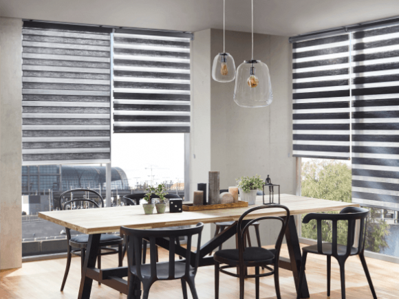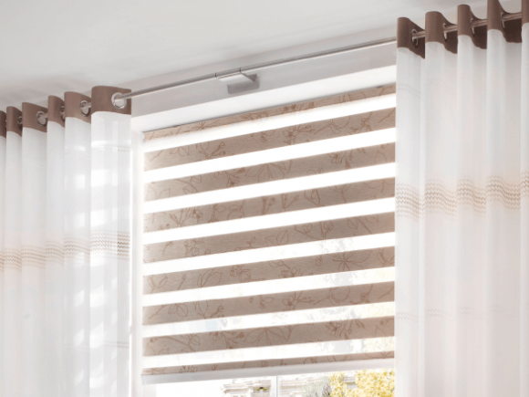 Ein Doppelrollo verbindet die Vorteile eines Rollos mit der Funktionalität einer Jalousie. In der Höhe flexibel am Fenster positionierbar kann gleichzeitig durch Verschieben der Stoffbahn Durchsicht und Lichteinfall gesteuert werden.